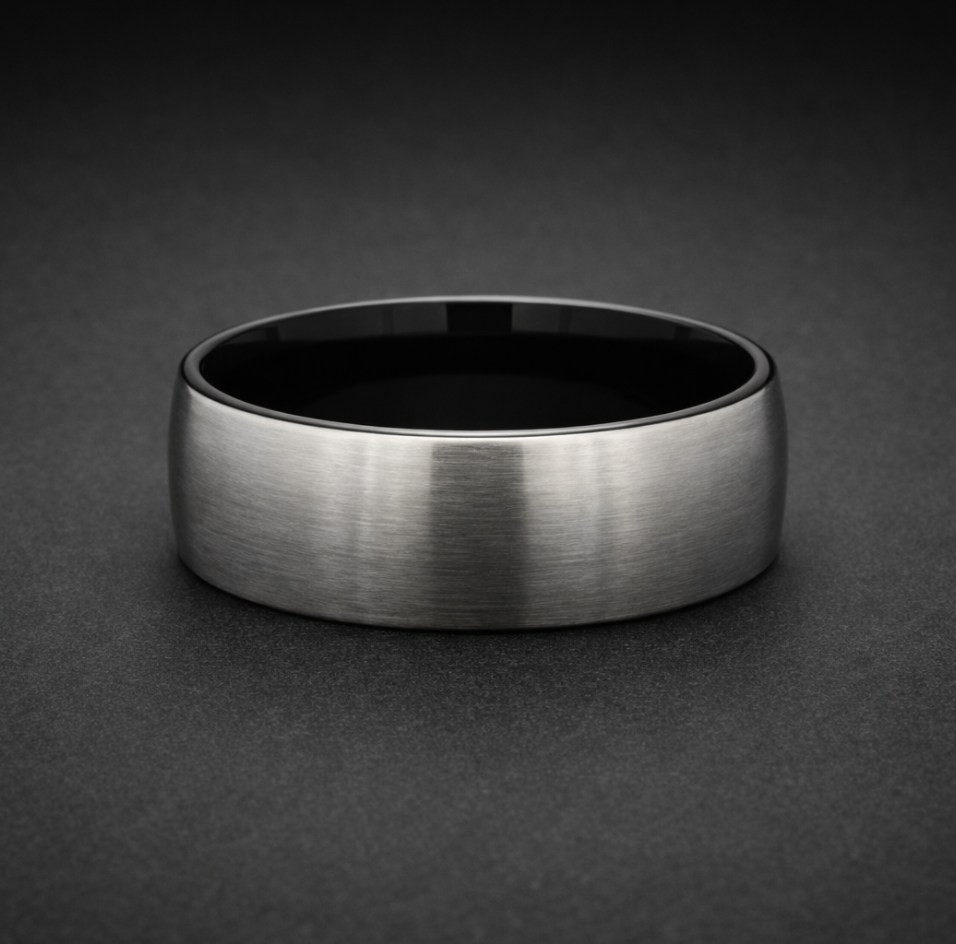 Sleek and minimalist, theLunar Edge ring blends brushed silver elegance with a smooth black interior for a look that’s both modern and timeless. Its clean, seamless profile makes it an ideal choice for those who value simplicity with edge.
