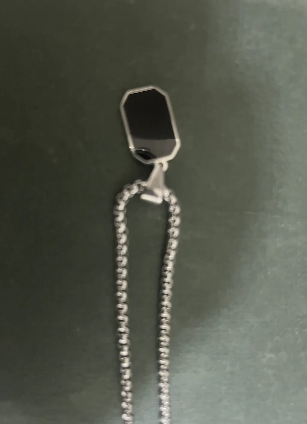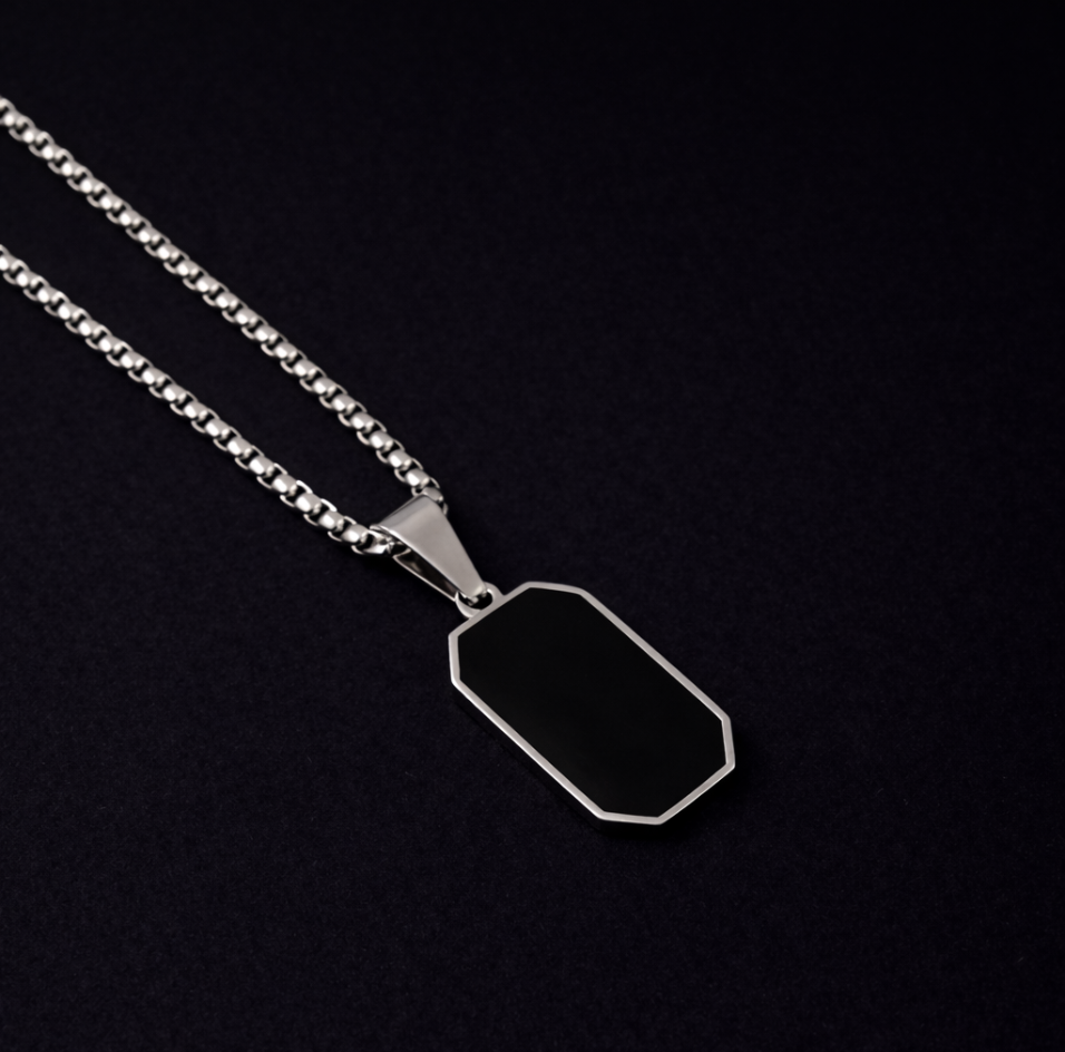 Refined and effortlessly modern, The Midnight Tag features a sleek, rectangular pendant with a polished black center set in a sharp silver border. Its geometric silhouette and clean finish make it a bold statement of minimalism and strength.